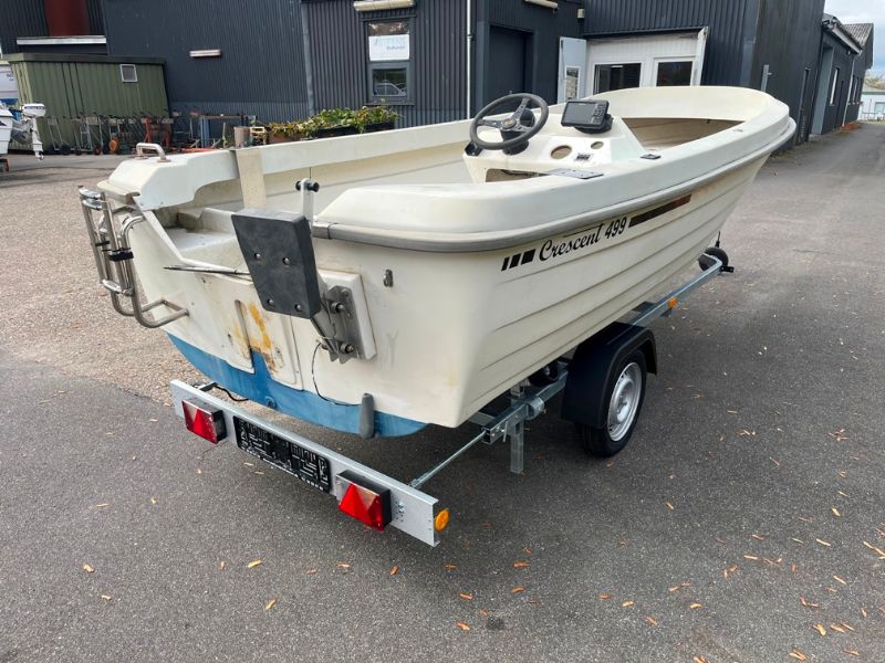 Fin Crescent 499 som er perfekt til fiskeri & gode stunder på havet. Perfekt til fiskeri i alle danske farvande i denne meget stabile jolle fra Svenske Crescent. God plads rundt i båden, og rigtig fine siddepladser. Båden er fra 1995 og godkendt til 40hk, last 480kg, 6 pers., vægt 300kg, længde 5,06m, bredde 1,95m. Den har samme yderskrog som den nyere Crescent 506 Argo